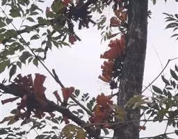火焰树(Spathodea campanulata Beauv.)别名火烧花、喷泉树、苞萼木、火焰木,是加蓬共和国的国树。为紫葳科落叶大乔木,又名苞萼木,原产非洲,花期冬春之间,花朵杯形硕大,树高约10米,长约10-12厘米,冠幅较大,常作荫庇树或行道树,也适宜公园、社区、旅游区等地种植。细细观之,深红色的花瓣边缘有一圈金黄色的花纹,异常绚丽。