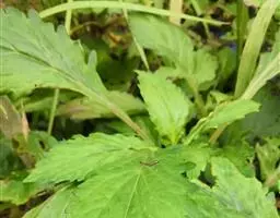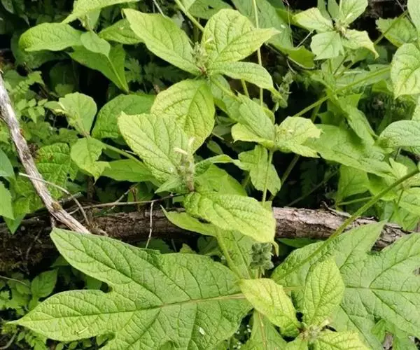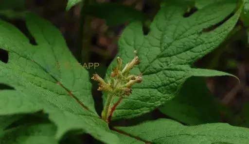 图版24: 4-6 叶羽状深裂,基部楔形至宽楔形,近无柄,轮廓倒卵形至倒卵状椭圆形,长8-20厘米,宽6-18厘米,裂片1-3对,无锯齿,顶端渐尖,上面浅绿色,散生刚毛,沿脉及边缘毛较密,背面黄白色;茎基部的初生叶有时不分裂。聚伞花序对生,各具3朵花,无总花梗,有时花序下具卵全缘的苞片,在茎或分枝顶端集合成短穗状花序;萼筒被刚毛和腺毛,萼裂片三角形,长3毫米;花冠黄绿色,狭钟状,长1厘米,筒基部弯曲,一侧膨大成浅囊,被腺毛,裂片圆而短,内面有带紫色斑点;雄蕊着生于花冠筒中部以下,花丝短,花药矩圆形,花柱基部被长柔毛,柱头楔状头形。果癸卵圆,肉质,具3条槽,长10毫米,冠以宿存的萼齿;核3枚,扁,亮黑色。种子凸平,腹面具2条槽。花期5-6月,果期8-9月。