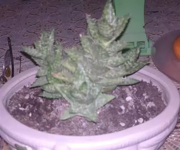 株高30~40厘米,株幅20厘米。叶片互生,旋列于茎顶,叶螺旋 状互生,茎顶部排列成较紧密的莲座叶盘,叶三角形,表面凹背面圆凸,先端急尖,淡绿色至黄绿色,光线过强时呈褐绿色。叶缘有白色的白齿(0.5厘米长),叶面和叶背都有不规则形状的白色星点,时而连合成线状。夏季开花,松散的总状花序,长达25厘米,花小,橙黄至橙红色,带绿尖。三裂蒴果小,形状奇特。