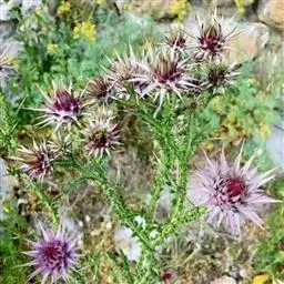 头状花序通常2-3个生于枝顶端,或排列成分枝宽圆锥状或伞房状;径8-10毫米,具75-100个花;花序梗长5-25毫米,密被绢状长柔毛,无苞片;总苞扁球状,长6-7毫米,宽8-10毫米,基部圆形,多少凹入;总苞片4-5层,绿色,披针形,向外渐短,最外层开展,长3-4毫米,近刺状渐尖,背面绿色或多少紫色,边缘杆黄色,近革质,被绢状柔毛,杂有腺体,中层和内层狭长圆状披针形,长约6毫米,顶端具短刺尖;花托稍凸起,具边缘具细齿的窝孔;花淡红紫色,花冠管状,长4-5毫米,向上稍扩大,裂片线状披针形,顶端尖,外面被疏微毛和腺;