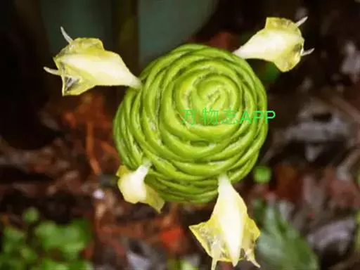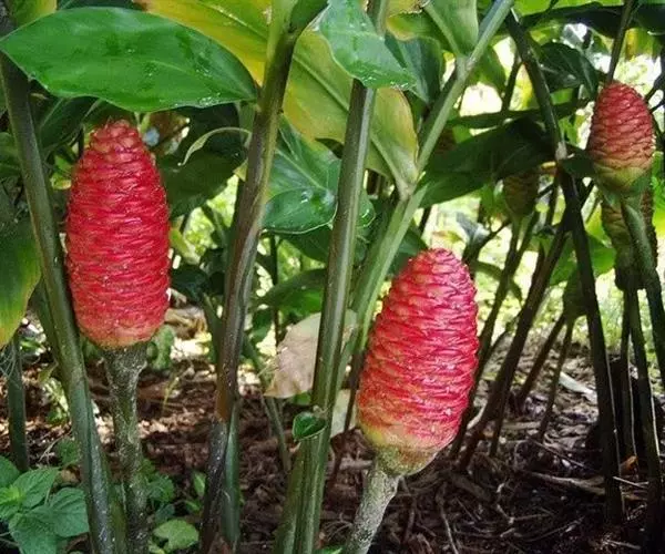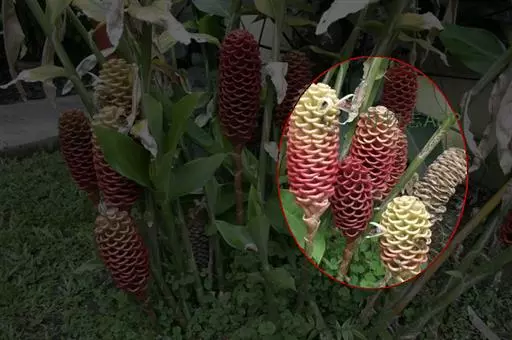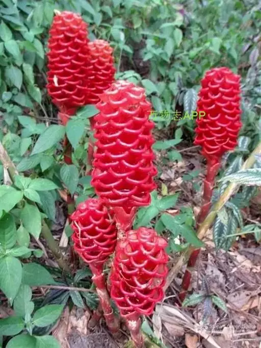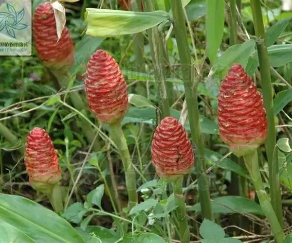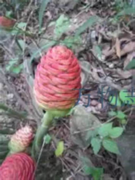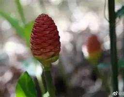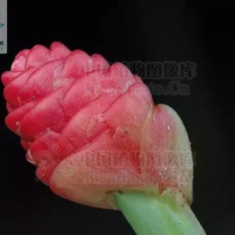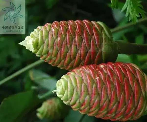 穗状花序着生于花茎顶端,近长圆形,松果状。苞片密集,覆瓦状排列,幼时绿色,后转红色。小花具细长花冠筒,檐部3裂,白色。花期夏、秋季。总花梗长10-30厘米,被5-7枚鳞片状鞘;花序球果状,顶端钝,长6-15厘米,宽3.5-5厘米;苞片覆瓦状排列,紧密,近圆形,长2-3.5厘米,初时淡绿色,后变红色,边缘膜质,被小柔毛,内常贮有粘液;花萼长1.2-2厘米,膜质,一侧开裂;花冠管长2-3厘米,纤细,裂片披针形,淡黄色,后方的一枚长,长1.5-2.5厘米;唇瓣淡黄色,中央裂片近圆形或近倒卵形,长1.5-2厘米,宽约1.5厘米,顶端2裂,侧裂片倒卵形,长约1 厘米;雄蕊长1厘米,药隔附属体喙状,长8毫米。蒴果椭圆形,长8-12毫米;种子黑色。花期:7-9月,果期:10月。 [3-5]