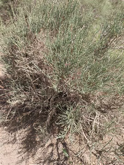 高达1米,木质茎粗长,直立,稀部分匍匐状,基部径达1-1.5厘米,中部茎枝一般径3-4毫米;小枝细,径约1毫米,节间短,长1-3.5厘米,多为1:5-2.5厘米,纵槽纹细浅不明显,常被白粉呈蓝绿色或灰绿色。