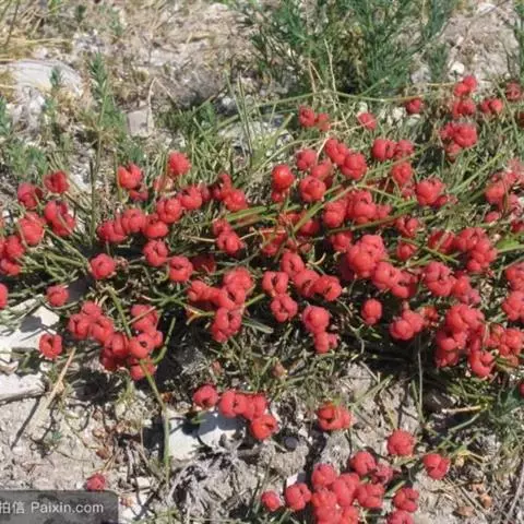 直立小灌木,茎直立;叶褐色,大部合生;花近于卵圆形,花期6-7月;种子窄长卵圆形,种子8-9月成熟。产于北方部分省区。