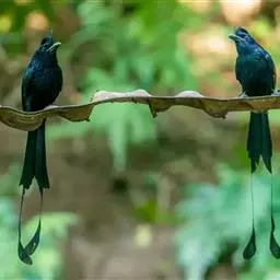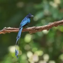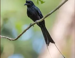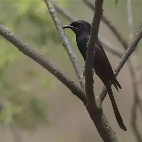 发冠卷尾是中型鸟类,体长28-35厘米。通体绒黑色缀蓝绿色金属光泽,额部具发丝状羽冠,…