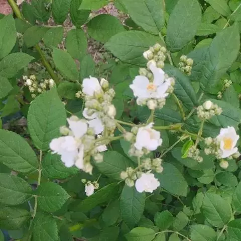常绿或半常绿攀援灌木,有长匍匐枝,枝粗壮,无毛,有散生而粗短钩状皮刺。小叶5-9,连叶柄长5-10厘米;小叶片椭圆形、卵形或长圆卵形,长2-7厘米,宽1.5-3厘米,先端急尖或渐尖,稀尾状渐尖,基部楔形或近圆形,边缘有紧贴的锐锯齿,两面无毛,革质;托叶大部贴生于叶柄,无毛,边缘或仅在基部有腺,顶端小叶片有长柄,总叶柄和小叶柄有稀疏小皮刺和腺毛。花单生或2-3朵,直径5-8厘米;花梗长2-3厘米,无毛或有腺毛;萼片全缘,稀有少数羽状裂片,披针形,先端长渐尖,外面无毛,内面密被长柔毛;花瓣芳香,白色或带粉红色,倒卵形;心皮多数,被毛;花柱离生,伸出花托口外,约与雄蕊等长。果实呈压扁的球形,稀梨形,外面无毛,果梗短。花期6-9月。