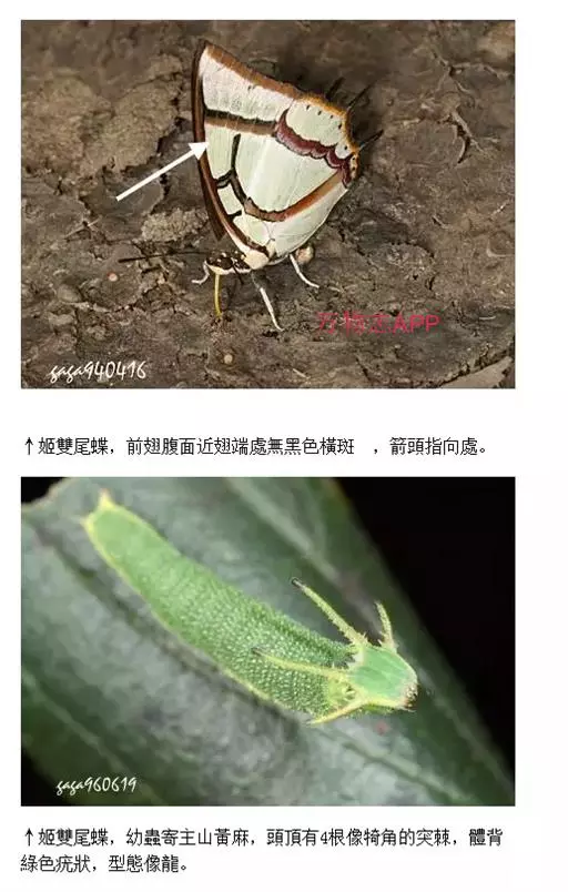 二尾蛱蝶的一龄幼虫从卵钻出来就已经有四只角了,但中间的一对明显较长。而进入二龄后与外侧角的大小比 例便缩小了。头部也从黑褐色渐渐转为绿色。尾须也渐渐变短。
