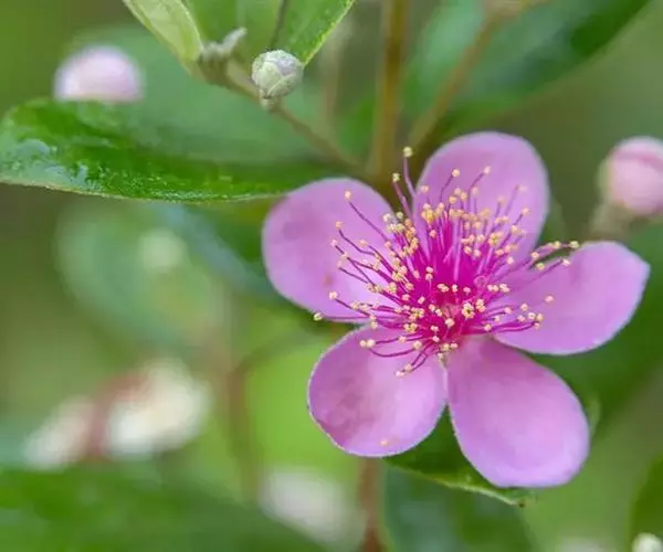 花3-11朵簇生,花梗长1-2厘米,无毛或疏被粗毛;小苞片3,长圆形,长3-4毫米,宽1-2毫米,先端圆形,疏被柔毛;萼状,长6-7毫米,萼裂片5,宽三角形,两面均被星状疏柔毛;花紫红色或白色,直径3.5-4厘米,花瓣5,匙形,长2厘米,先端微缺,爪具髯毛;雄蕊柱长8-10毫米,被刺毛,花丝无毛;花柱分枝9-11,被微细毛。
