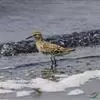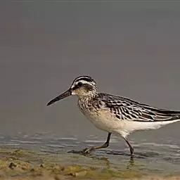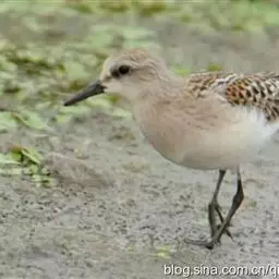 阔嘴鹬是涉禽,体长17厘米。特征为翼角常具明显的黑色块斑并具双眉纹。与黑腹滨鹬平滑下弯的嘴相比,…