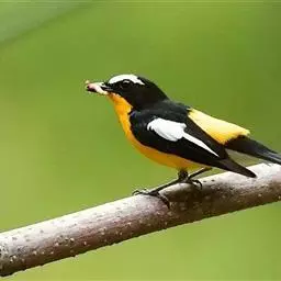 白眉姬鹟是小型鸟类,体长11-14厘米。雄鸟上体大部黑色,眉纹白色,在黑色的头上极为醒目。腰鲜黄色,…