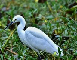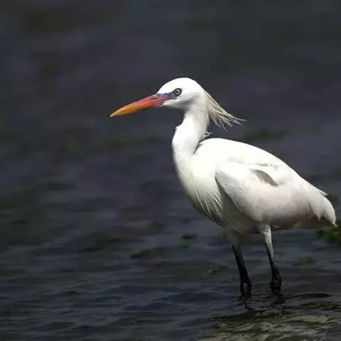 描述:中等体型(60厘米)的白色鹭。与牛背鹭的区别在体型较大而纤瘦,嘴及腿黑色,趾黄色,繁殖羽纯白,颈背具细长饰羽,背及胸具蓑状羽。