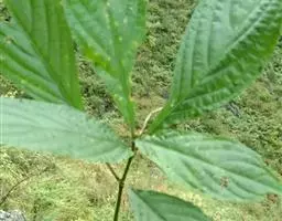 叶卵状矩圆形,长5-12厘米,宽2.5-4厘米,顶端渐尖或尾尖.基部钝或急尖。
