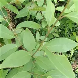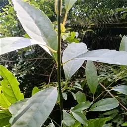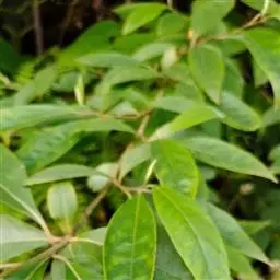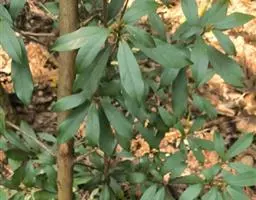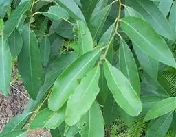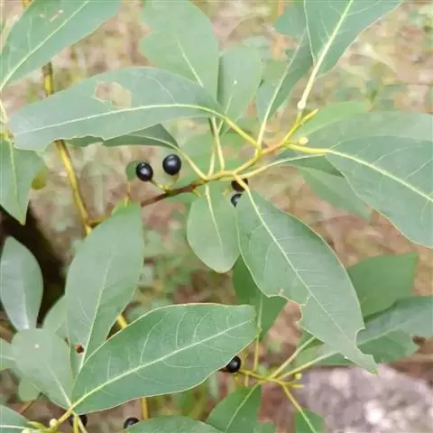 叶互生,纸质,有香气,披针形或长圆状披针形,长7-11厘米,宽1.4-2.4厘米,先端渐尖,基部楔形,全缘,上面深绿色,下面粉绿色,苍白色。两面均无毛,羽状脉,侧脉每边6-10条,纤细,中脉、侧脉在两面均突起;叶柄长6-20毫米,纤细,无毛。