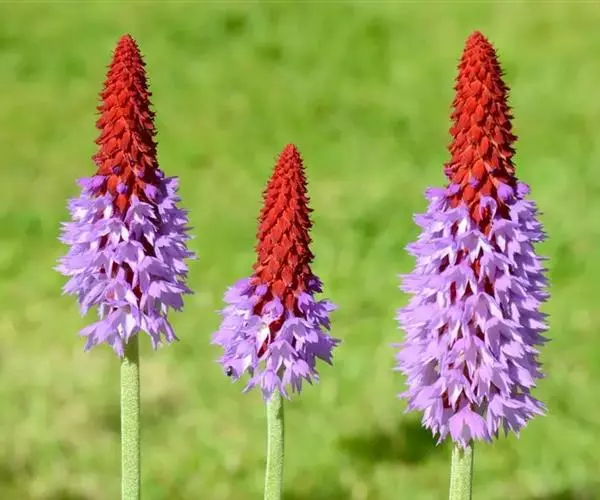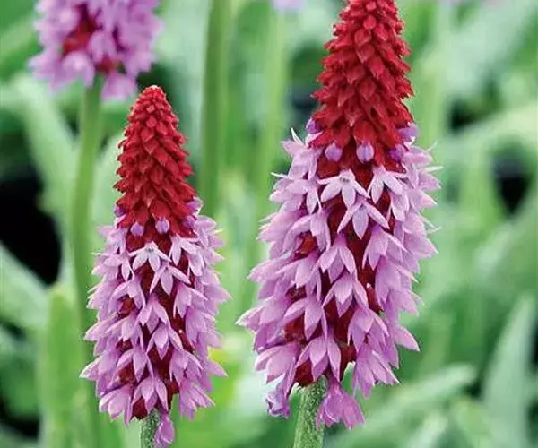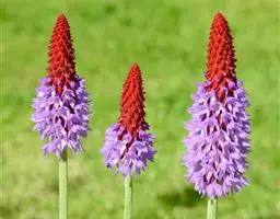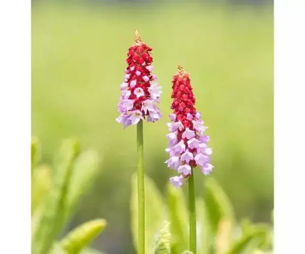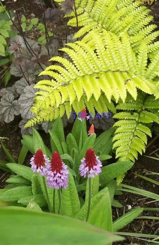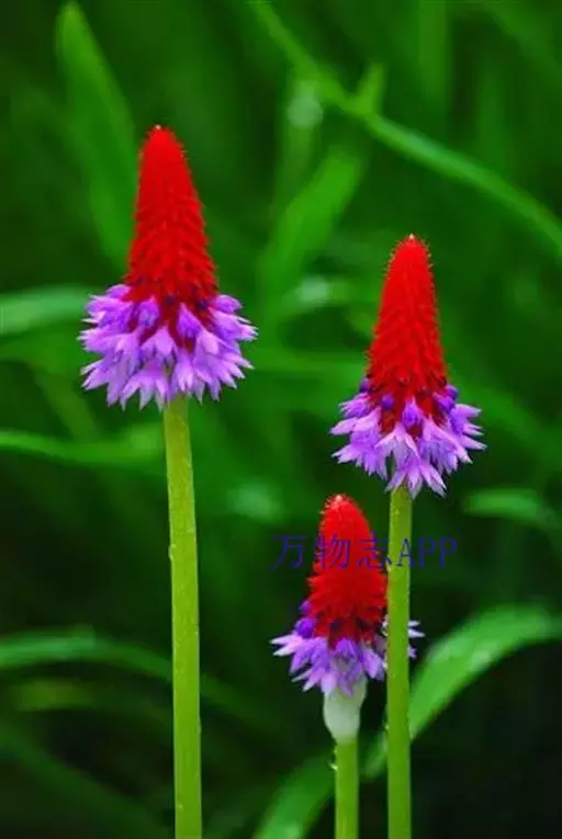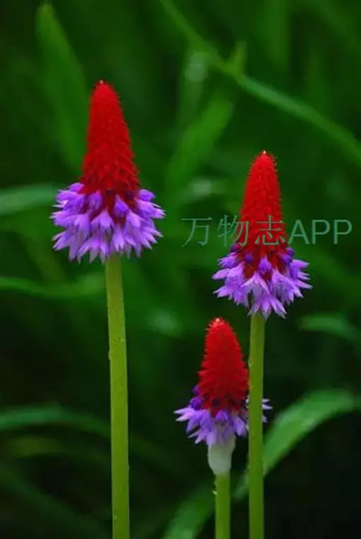 高穗花报春(学名:Primula vialii Delavay ex Franch.):报春花科,报春花属多年生草本植物,根状茎短,侧根粗长。叶狭椭圆形至矩圆形或倒披针形,先端圆钝,边缘小牙齿,两面均被柔毛,叶柄通常短于叶片,花葶高可达60厘米,无毛,穗状花序多花,花未开时呈尖塔状,花全部开放后呈筒状,苞片线状披针形,花蕾期外面深红色,后渐变为淡红色,花冠蓝紫色,裂片卵形至椭圆形,雄蕊近冠筒口着生,蒴果球形,稍短于宿存花萼。7月开花。