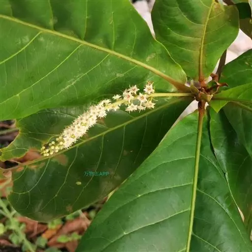 穗状花序长而纤细,腋生,长15-20厘米,雄花生于上部,两性花生于下部;苞片小,早落;花多数,绿色或白色,长约10毫米;花瓣缺;萼筒杯状,长8毫米,外面无毛,内面被白色柔毛,萼齿5,三角形,与萼筒几等长;雄蕊10枚,长约2.5毫米,伸出萼外;花盘由5个腺体组成,被白色粗毛;子房圆锥形,幼时被毛,成熟时近无毛;花柱单一,粗壮;胚珠2颗,倒悬于室顶。果椭圆形,常稍压扁,具2棱,棱上具翅状的狭边,长3-4.5厘米,宽2.5-3.1厘米,厚约2匣米,两端稍渐尖,果皮木质,坚硬,无毛、成熟时青黑色;种子一颗,矩圆形,含油质。花期3-6月,果期7-9月。