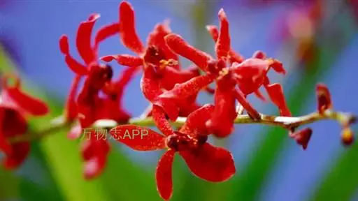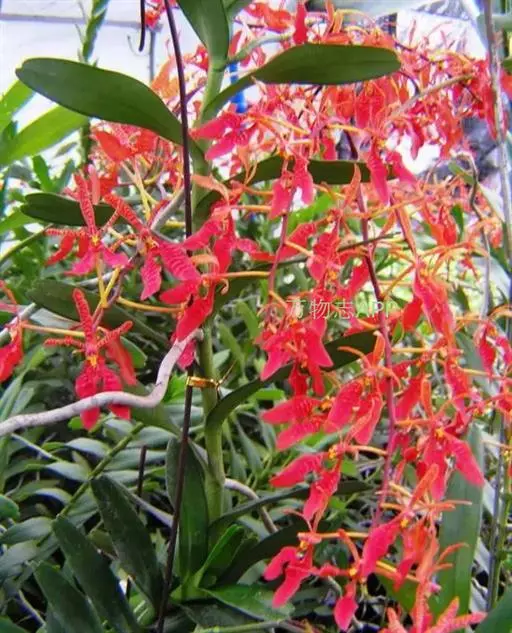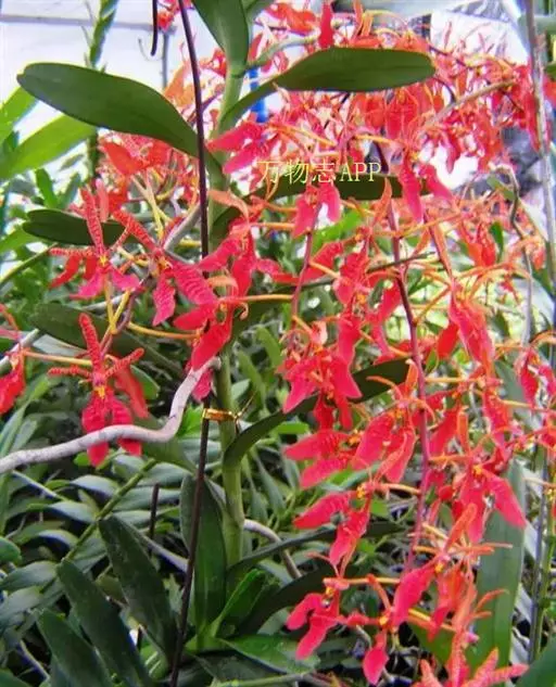 麒麟火焰兰 麒麟火焰兰,株型直立,叶带形、绿色、质硬;花色橙红,带鲜红色的斑点;花葶直径约3.0毫米,长可达43厘米以上,分枝数0—4个,主枝着生花朵数可达16—20朵,总花朵数可达25朵以上,花朵长约5.0厘米、宽约6.0厘米。在广州地区简易大棚栽培2月底到3月初开花,花期长可达2—3个月,表现出较强的耐热性、耐冷性以及抗病性。