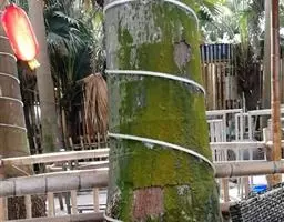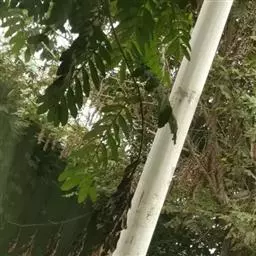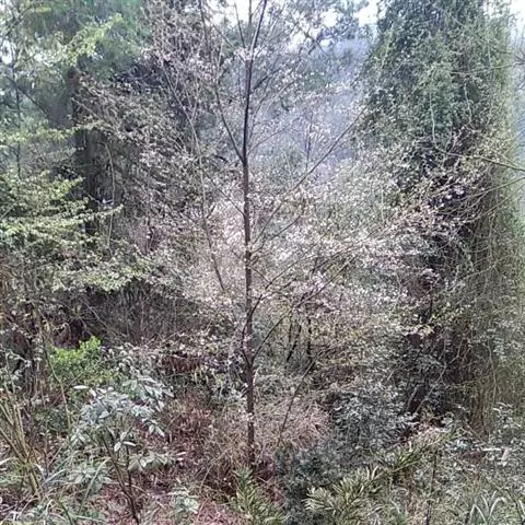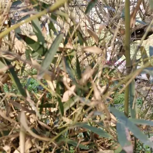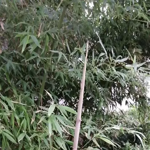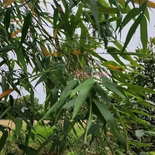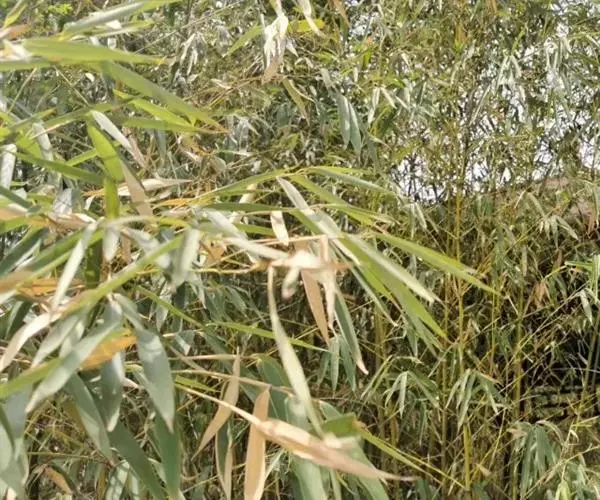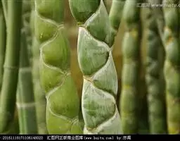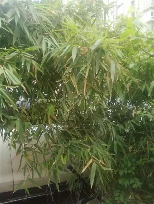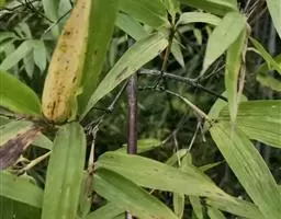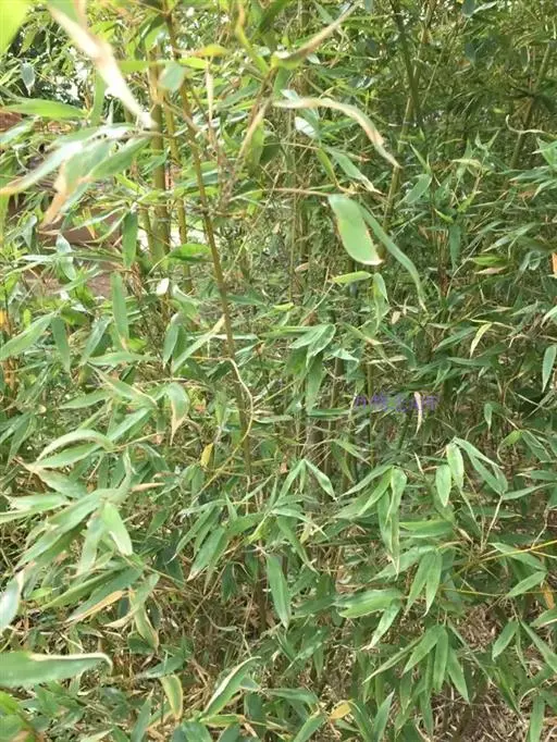 树竿高2— 5米,直径4-10厘米,幼时无毛,微被白粉,绿色,成长的竿呈绿色或黄绿色,在10倍放大镜下可见猪皮状小凹穴或白色晶体状小点;中部节间长20--45厘米,壁厚约5毫米;竿环在较粗大的竿中于不分枝的各节_L不明显;捧环微隆起。捧鞘背面呈乳黄色或绿黄褐色又多少带灰色,有绿色脉纹,无毛,微被白粉,有淡褐色或褐色略呈圆形的斑点及斑块;捧耳及鞘口缝毛俱缺;捧舌绿黄色,拱形或截形,边缘生淡绿色或白色纤毛;捧片狭三角形至带状,外翻,微皱曲,绿色,但具桔黄色边缘。末级小枝有2-5叶;叶鞘几无毛或仅上部有细柔毛;叶耳及鞘口缝毛均发达;叶片长圆状披针形或披针形,长5. 6-13厘米,宽1.1-1. 2厘米。花枝未见。笋期5月中旬。