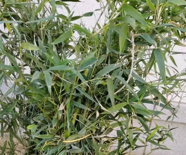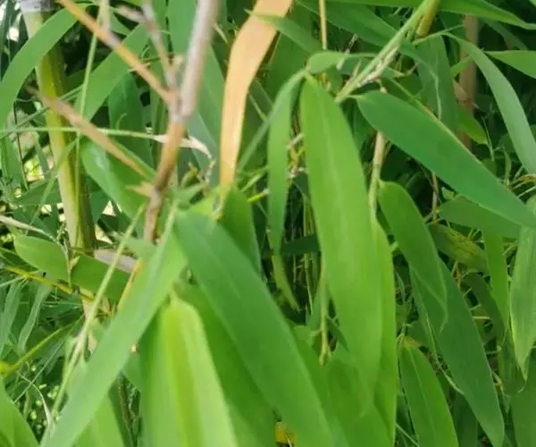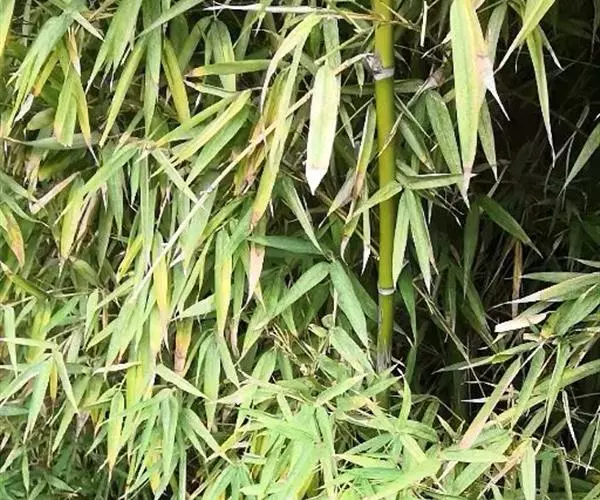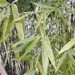 刚竹 秆高10-15米、径8-10厘米,淡绿色。枝下各节无芽,秆环平,但分枝各节则隆起。全秆各节箨环均突起,新竹无毛,微被白粉;老竹仅节下有白粉环。节间具猪皮状皮孔区,秆箨密布褐色斑点或斑块,先端截平,边缘具较粗须毛,无箨耳和繸毛。箨舌紫绿色,箨叶带状披针形,平直、下垂,每小枝有2-6片叶,披针形,翠绿色至冬季转黄色。盛笋期5月中旬,生笋味微苦,熟笋无苦味,味淡供食用。