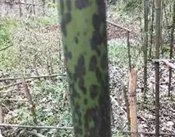 (2)镰刀菌喜欢生长在通气的酸性土壤,可结合冬季竹林抚育,在林中撒一薄层石灰,每667m2撒100kg,改变酸性,并覆盖10cm左右厚的黄心土能起一定抑制作用。根据病害发生规律,在孢子传播期,喷多菌灵等农药,可防止紫病斑扩散。
