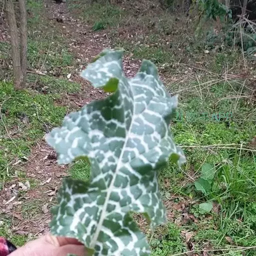 莲座状基生叶与下部茎叶有叶柄,全形椭圆形或倒披针形,长达50厘米,宽达30厘米,羽状浅裂至全裂;中部与上部茎叶渐小,长卵形或披针形,羽状浅裂或边缘浅波状圆齿裂,基部尾状渐尖,基部心形,半抱茎,最上部茎叶更小,不分裂,披针形,基部心形抱茎。全部叶两面同色,绿色,具大型白色花斑,无毛,质地薄,边缘或裂片边缘及顶端有坚硬的黄色的针刺,针刺长达5毫米。