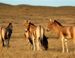 蒙古野驴:是马属动物“亚洲野驴”的指名亚种,外形似骡,体长可达260厘米,肩高约120厘米,…