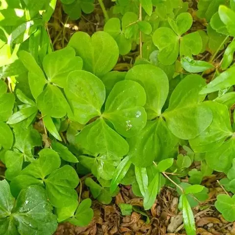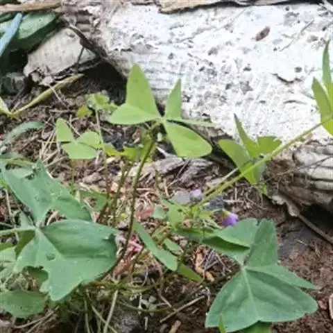 叶基生;叶柄长5-30厘米或更长,被毛;小叶3,扁圆状倒心形,长1-4厘米,宽1.5-6厘米,顶端凹入,两侧角圆形,基部宽楔形,表面绿色,被毛或近无毛;背面浅绿色,通常两面或有时仅边缘有干后呈棕黑色的小腺体,背面尤甚并被疏毛;托叶长圆形,顶部狭尖,与叶柄基部合生。总花梗基生,二歧聚伞花序,通常排列成伞形花序式,总花梗长10-40厘米或更长,被毛;花梗、苞片、萼片均被毛;花梗长5-25毫米,每花梗有披针形干膜质苞片2枚;萼片5,披针形,长约4-7毫米,先端有暗红色长圆形的小腺体2枚,顶部腹面被疏柔毛;花瓣5,倒心形,长1.5-2厘米,为萼长的2-4倍,淡紫色至紫红色,基部颜色较深;雄蕊10枚,长的5枚超出花柱,另5枚长至子房中部,