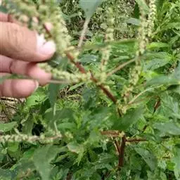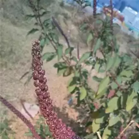 绿穗苋(学名:Amaranthus hybridus L. )是苋科、苋属一年生草本植物,高可达50厘米;茎直立,叶片卵形或菱状卵形,基部楔形,上面近无毛,下面疏生柔毛;叶柄有柔毛。花序顶生,细长,由穗状花序而成,中间花穗最长;苞片及小苞片钻状披针形,中脉坚硬,绿色,花被片矩圆状披针形,中脉绿色;胞果卵形,环状横裂,种子近球形,7-8月开花,9-10月结果。