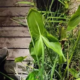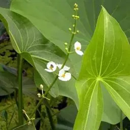 慈姑(学名:Sagittaria trifolia L. var. sinensis (Sims.) Makino )泽泻科多年生草本植物,生在水田里,叶子像箭头,开白花。地下有球茎,黄白色或青白色,以球茎作蔬菜食用。可以吃。也作茨菰。本变种与原变种不同在于:植株高大,粗壮;叶片宽大,肥厚,顶裂片先端钝圆,卵形至宽卵形;匍匐茎末端膨大呈球茎,球茎卵圆形或球形,可达5-8×4-6厘米;圆锥花序高大,长20-60厘米,有时可达80厘米以上,着生于下部,具1-2轮雌花,主轴雌花3-4轮,位于侧枝之上;雄花多轮,生于上部,组成大型圆锥花序,果期常斜卧水中;果期花托扁球形,直径4-5毫米,高约3毫米。种子褐色,具小凸起。