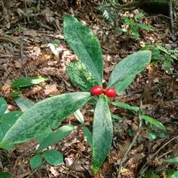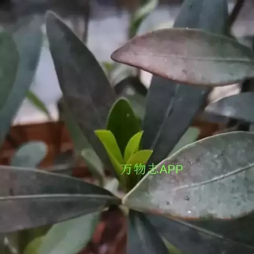 常绿直立灌木;枝粗壮,通常二歧分枝,小枝近圆柱形,紫红色或紫褐色,无毛。叶互生,纸质,长圆形或倒卵状椭圆形,长7-13厘米,宽2.5-5厘米,先端钝尖,基部楔形,边缘全缘,上面绿色,下面淡绿色,两面无毛,侧脉7-13对,与中脉在两面均明显隆起;叶柄粗壮,长4-10毫米,散生极少的微柔毛或无毛。