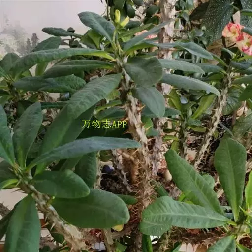 铁海棠是蔓生灌木植物。茎多分枝,长60-100厘米,直径5-10毫米,具纵棱,密生硬而尖的锥状刺,刺长1-1.5 (2.0)厘米,直径0.5-1.0 毫米,常呈3-5列排列于棱脊上,呈旋转。