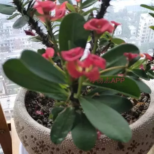 铁海棠(学名:Euphorbia milii Ch. des Moulins):是双子叶植物纲、大戟科的蔓生灌木。茎多分枝,长60-100厘米,直径5-10毫米,具纵棱,密生硬而尖的锥状刺,常呈3-5列排列于棱脊上,呈旋转。叶互生,通常集中于嫩枝上,倒卵形或长圆状匙形,全缘;托叶钻形,长3-4毫米,极细,早落。花序2. 4或8个组成二歧状复花序,生于枝上部叶腋;总苞钟状,高3-4毫米,直径3.5-4.0 毫米,边缘5裂,裂片琴形,上部具流苏状长毛,且内弯;腺体5枚,肾圆形,黄红色。雄花数枚;苞片丝状,先端具柔毛;雌花1枚。蒴果三棱状卵形,平滑无毛,成熟时分裂为3个分果爿。种子卵柱状,灰褐色,具微小的疣点;无种阜。花果期全年。