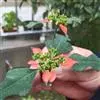 花序2. 4或8个组成二歧状复花序,生于枝上部叶腋;复序具柄,长4-7厘米;每个花序基部具6-10毫米长的柄,柄基部具1枚膜质苞片,长1-3毫米,宽1-2毫米,上部近平截,边缘具微小的红色尖头;苞叶2枚,肾圆形,长8-10毫米,宽12-14毫米,先端圆且具小尖头,其部渐狭,无柄,上面鲜红色,下面淡红色,紧贴花序;总苞钟状,高3-4毫米,直径3.5-4.0 毫米,边缘5裂,裂片琴形,上部具流苏状长毛,且内弯;腺体5枚,肾圆形,长约1毫米,宽约2毫米,黄红色。雄花数枚;苞片丝状,先端具柔毛;雌花1枚,常不伸出总苞外;子房光滑无毛,常包于总苞内;花柱3,中部以下合生;柱头2裂。