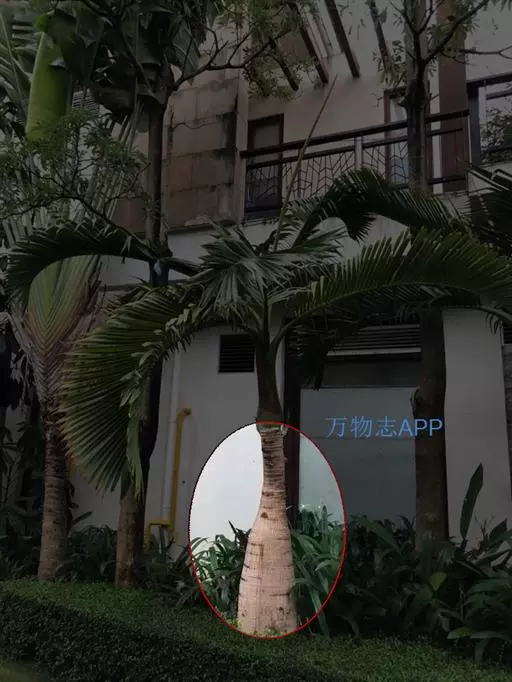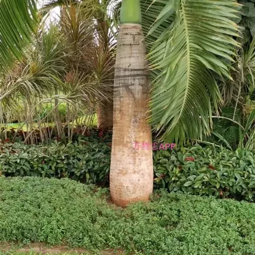 单干,树干短,肥似酒瓶,树高可达3米以上,胸径达38-60厘米。羽状复叶,叶长1.8-2.2米,小叶披针形,长约45厘米,宽3.8-5厘米,40-60对,中脉和侧脉凸起。叶柄长30-45厘米,淡红色,没有黄色的条纹。呈弓形后弯,叶鞘圆筒形。小苗时叶柄及叶面均带淡红褐色。雌雄同株,花柄长60厘米,佛焰苞柔软,长60厘米。果长3厘米,宽2.5厘米,表面粗糙,形状不规则,种子小而扁平。呈球状,长约1.3厘米。