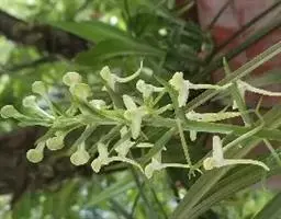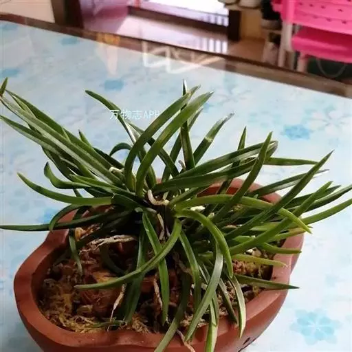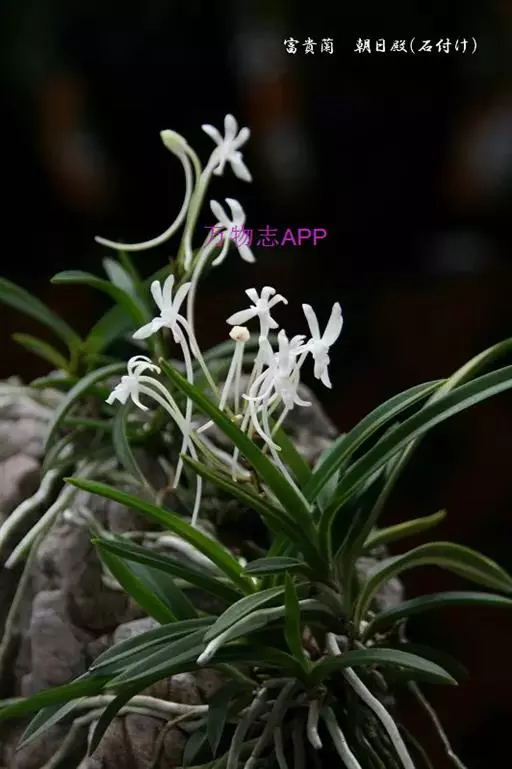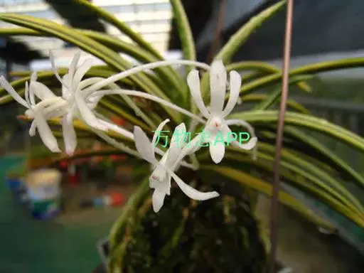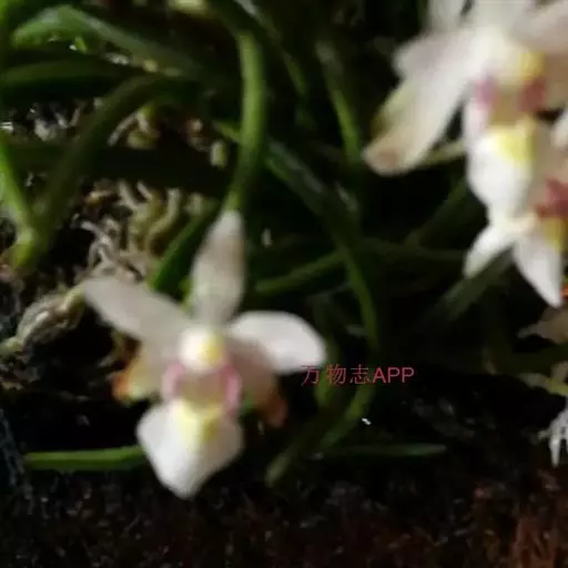 风兰(学名:Neofinetia falcata (Thunb. ex A. Murray) H. H. Hu):植株高8-10厘米。茎长1-4厘米,稍扁,被叶鞘所包。叶厚革质,狭长圆状镰刀形。总状花序长约1厘米,具2-5朵花;花白色,芳香;花瓣倒披针形或近匙形,长8-10毫米,宽2.2-3毫米,先端钝,具3条脉;唇瓣肉质,3裂。花期4月。