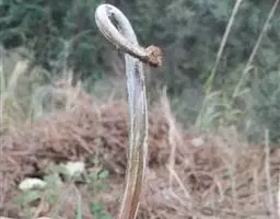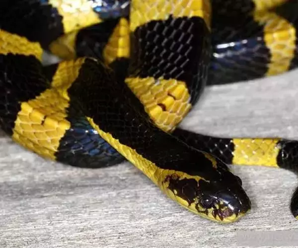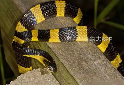金环蛇全长983—1,500mm,具有前沟牙。头呈椭圆形,尾极短, 图2:金环蛇 尾略呈三棱形,尾末端钝圆而略扁,通身呈黑色与黄色相间的少数明显的棱骨,黑色环纹和黄色环纹几乎等宽,黄色环纹在体部有20—28环,黑色环纹20—26+3—5。在尾部有3—5环,背鳞平滑共15行,背中央的1行鳞片特别大,肛磷完整,尾下鳞片为单行,腹部为灰白色。头背黑褐色,枕及颈部有污黄色的“∧”形斑。背脊隆起呈脊,所以躯干横切面略呈三角形,尾末端圆钝。头椭圆形,与颈区分较不明显,头背具有典型的9枚大鳞片,背鳞平滑,全身15行,背正中一行脊鳞扩大呈六角形。