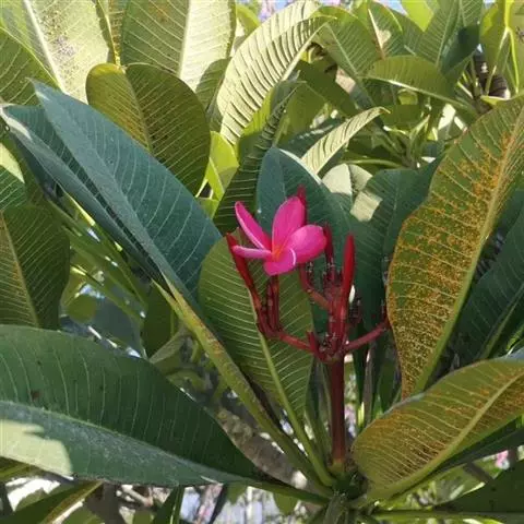 红鸡蛋花,夹竹桃科鸡蛋花属的落叶小乔木。叶形状为椭圆形或窄长椭圆形,长14-30厘米,叶下面呈淡绿色,…