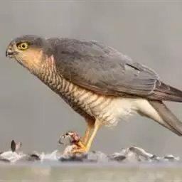 松雀鹰(学名:Accipiter virgatus)小型猛禽,体长28~38厘米。雄鸟上体黑灰色,喉白色,喉中央有一条宽阔而粗著的黑色中央纹,其余下体白色或灰白色,具褐色或棕红色斑,尾具4道暗色横斑。雌鸟个体较大,上体暗褐色,下体白色具暗褐色或赤棕褐色横斑。