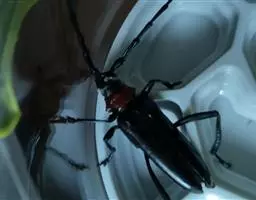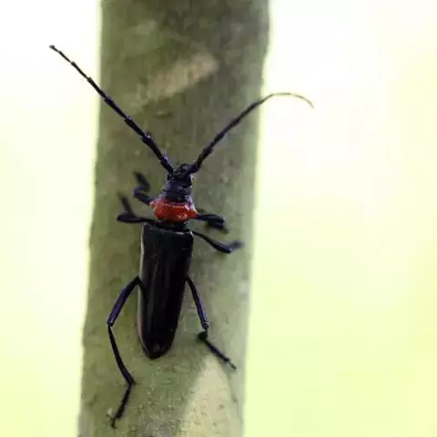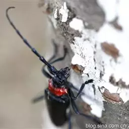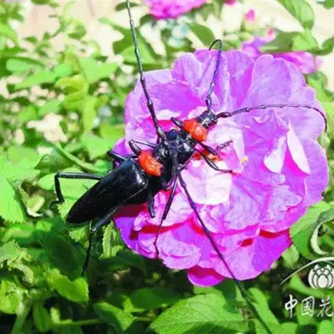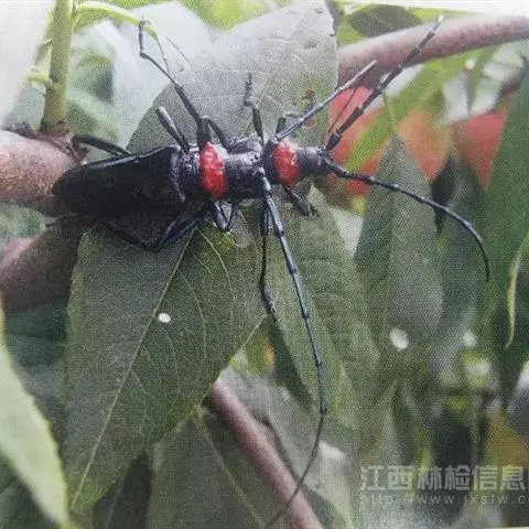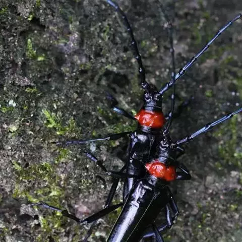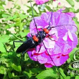 桃红颈天牛是天牛科、颈天牛属昆虫。体黑色发亮,前胸背面大部分为光亮的棕红色或完全黑色。头黑色,…