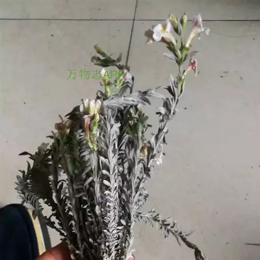 多年生草本,高15-23厘米,常有残留的隔年枯茎,全体因密被棉毛而呈灰白色,上部近花处除被棉毛外,还具腺毛。主根粗短,下部发出之许弯曲支根,成密丛。茎多数,丛生,基部多倾卧或弯曲,老时木质化,通常不分枝。叶交互对生,下部者间距极短,仅4毫米,密集,向上逐渐疏离,相隔可达10毫米,至花序附近间距最大,可达16毫米,叶片大小,亦作相同的变异,下方者最小,鳞片状,向上则逐渐增大,成长圆状披针形至线状披针形,通常长12-20毫米,宽2-3毫米,最长可达25毫米,先端锐尖,或锐头而有小凸尖,基部渐狭,多少下延于茎成狭稜,中脉面凹背凸,两面均密被灰白色锦毛,老时上面的毛多少脱落。总状花序顶生;花少数,单生于叶腋,具长2-7毫米之短梗;叶状小苞片二枚,长9-15毫米,宽1-2毫米,生于萼管基部;萼筒状,膜质,被绵毛,或绵毛与腺毛相杂。管长5-7毫米。上有9条凸起的粗肋,其中4条分别通入萼齿;萼齿4枚,草质,线形或线状披针形而先端渐尖,与萼管等长或稍长,长5-6毫米,宽1-2毫米,有时长达10毫米,宽3毫米;花冠谈紫色或几白色,长约为萼的两倍,长15-18毫米,被少量柔毛,花管细长,近喉处扩大,瓣片二唇形,上唇略作盔状,2裂,下唇3裂,中裂稍大,均为倒卵形,端圆钝,多少开展;雄蕊4枚,二强,着生于花管上,前方一对较长,达7毫米左右,后方一对长约6毫米,花药背着,微露于花冠喉部,药2室,并行,相等,长2.5-2.8毫米,宽0.6-0.8毫米,彼此分离,长卵形,下部渐细,有一小凸尖,纵裂;子房长卵形,花柱细长,先端弯向前方,柱头长圆形。蒴果长圆形,长约9毫米,宽3毫米,厚2毫米,先端渐细而成一稍弯的尖嘴。花期3-4月。
