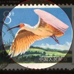 2000年2月25日发行的《国家重点保护野生动物(Ⅰ)级》小型张上,10枚中的第一枚是朱鹮。画面上只见一只朱鹮潇洒地低飞掠过碧绿的稻田、水塘,扇起的翅膀透出淡雅的橙红色,伸着细长的前端向下弯的嘴喙,一双黄亮的眼睛四下寻觅着它喜欢的食物,水中的鱼虾、田螺、青蛙和泥鳅。
