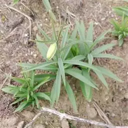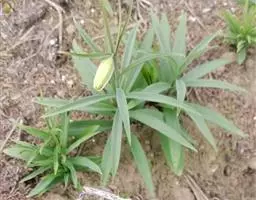 植株长50~80厘米。叶在最下面的对生或散生,向上常兼有散生、对生和轮生的,近条形至披针形,长7~11厘米,宽1~2.5厘米,先端不卷曲或稍弯曲。花1~6朵,淡黄色,有时稍带淡紫色,顶端的花具3~4枚叶状苞片,其余的具2枚苞片;苞片先端卷曲;花被片长2.5~3.5厘米,宽约1厘米,内外轮的相似;雄蕊长约为花被片的2/5;花药近基着,花丝无小乳突;柱头裂片长1.5~2毫米。蒴果长2~2.2厘米,宽约2.5厘米,棱上有宽约6~8毫米的翅。花期3~4月,果期5月。