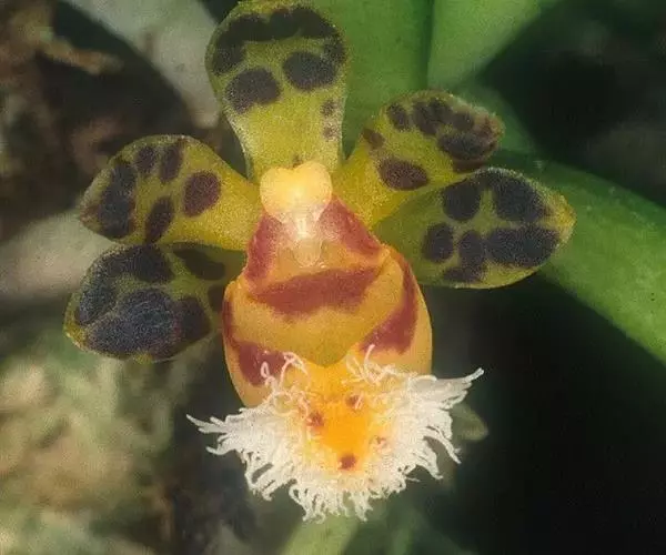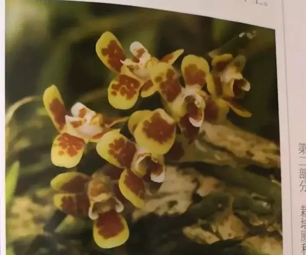 盆距兰(学名:Gastrochilus calceolaris (Buch.-Ham. ex J. E. Smith) D. Don):茎长5-30厘米,粗5-8毫米,常弧形弯曲,具多数叶。叶二列互生,稍肉质,常镰刀状狭长圆形。伞形花序数至10余个,侧生于茎的上部,与叶对生,具多数花;花开展,萼片和花瓣黄色带紫褐色斑点;花瓣近似于萼片,较小,先端圆钝;前唇半圆状三角形或新月状三角形,向前伸展,长2-3毫米,宽5-7毫米,边缘具不整齐的流苏或啮蚀状,上面中央增厚的垫状物黄色带紫色斑点、无毛。花期3-4月。