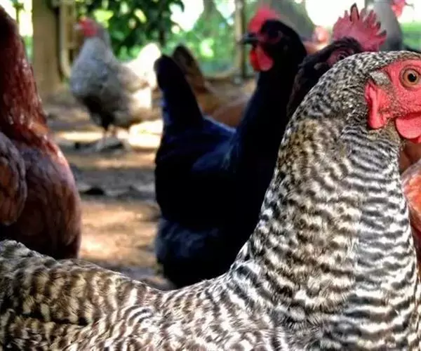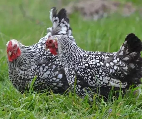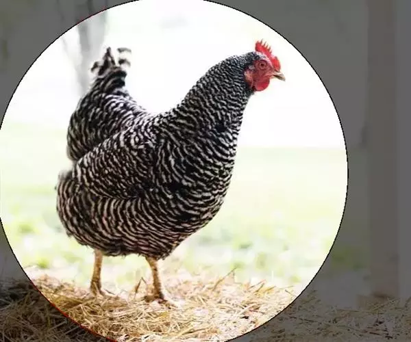 属蛋肉兼用型鸡种。该鸡体型一致,颈部挺立,稍显高昂,前躯稍窄,背长而平直,后躯宽而丰满,腿较长,尾羽高翘,体形呈“元宝”状。横斑羽是该鸡外貌的基本特征。全身大部分羽毛呈黑白相问、宽窄一致的斑纹状。母鸡头部和颈羽边缘镶嵌橘红色或土黄色,羽毛紧密。公鸡颈羽和鞍羽多呈红色,尾羽黑色带有绿色光泽。单冠最多,豆冠、玫瑰冠、豌豆冠和草莓冠较少。喙基部为黑色,边缘及尖端呈白色。虹彩橘红色。胫色以白色为主。爪部颜色大多白色,皮肤白色。成年鸡体重:公1400克,母1260克。180日龄屠宰率:半净膛,公81.2%,母80.0%;全净膛,公71.2%,母68.9%。开产日龄150~180天,在农村一般饲养管理条件下,年产蛋130~150个;较好饲养条件下产蛋180~200个。蛋重45克,蛋壳多为浅褐色 。