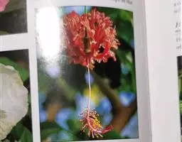 花:花单生于叶腋,花梗长2.5-6厘米,密被黄色星状绒毛,端具节;小苞片6,匙形,长8-12毫米,基部合生,密被黄色星状绒毛,花萼杯状,直径约2厘米,长2-2.2厘米,密被黄色星状绒毛,裂片5,三角状渐尖形,长为花萼的1/2,长2.5-3厘米,外面密被黄色星状长绒毛,内面疏被长柔毛,基部具髯毛;雄蕊柱长2-2.5厘米,不外露,花药红黄色;花柱枝5,具长丝状毛。