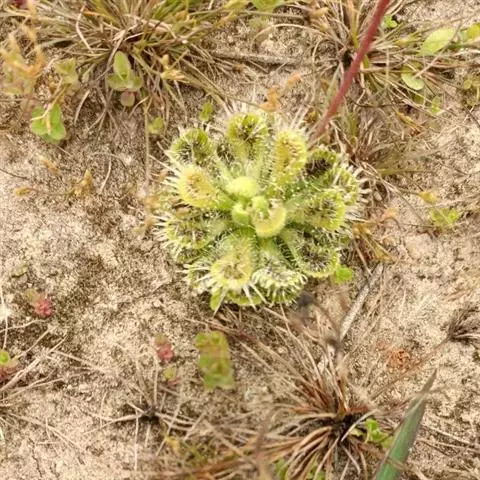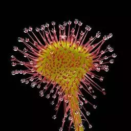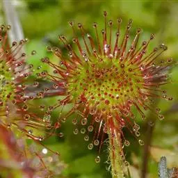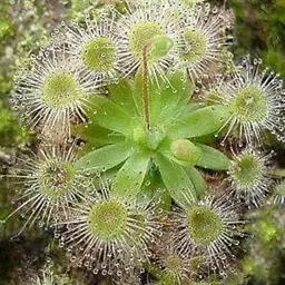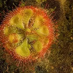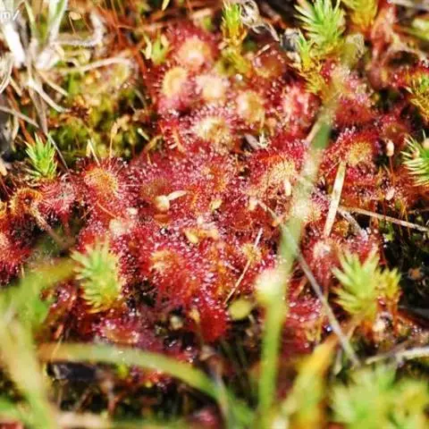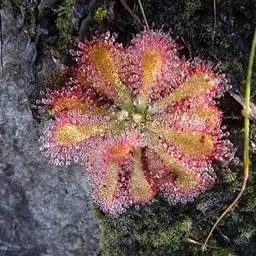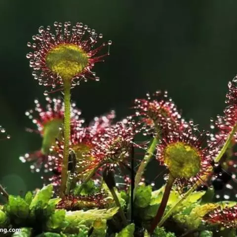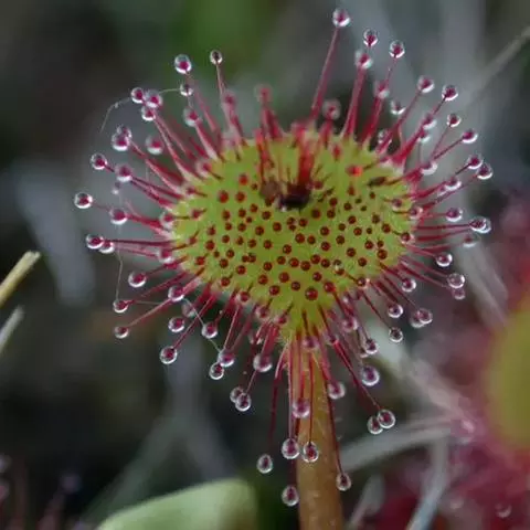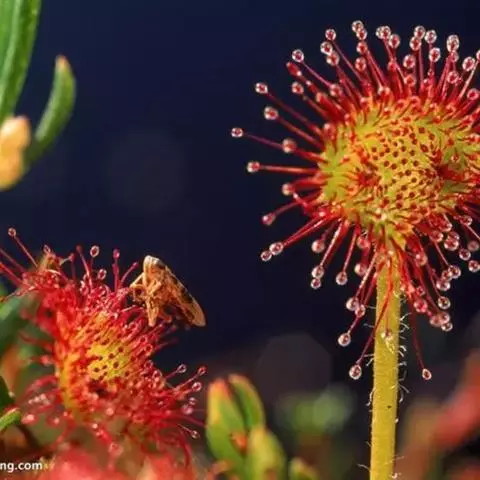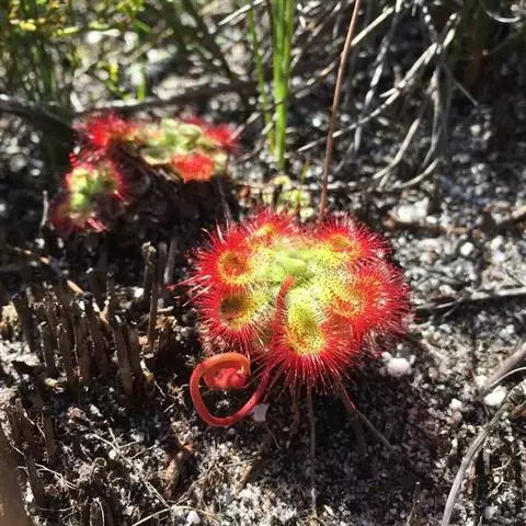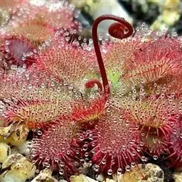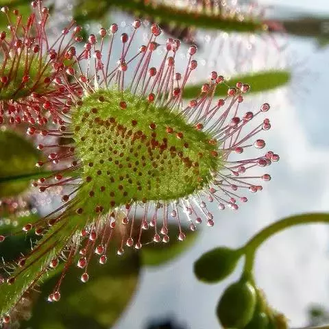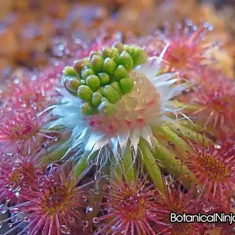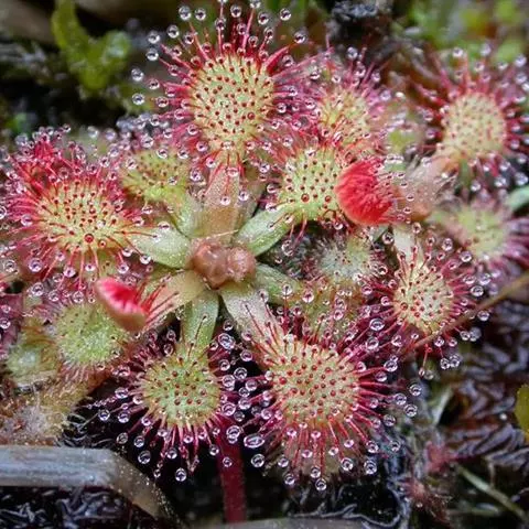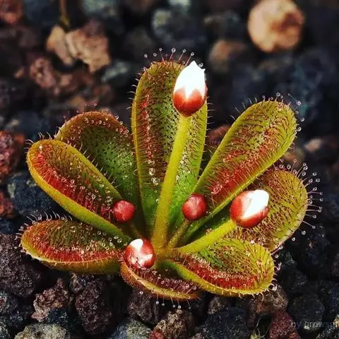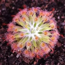 阿帝露茅膏菜 草本,通常多年生,直径2-20厘米;根状茎短,具不定根,常具有根功能的退化叶,末端具或不具鳞茎状球茎。叶互生或基生而莲座状密集,被头状粘腺毛,幼叶常拳卷;托叶膜质,常条裂。聚伞花序顶生或腋生,幼时弯卷;花萼5裂,稀4-8裂,基部多少合生,宿存;花瓣5,分离,花时开展,花后聚集扭转,宿存于顶部;雄蕊与花瓣同数,互生;子房上位,1室,侧膜胎座2-5,胚珠多数,稀少数;花柱3-5,稀2-6,呈各式分裂或不裂,宿存。蒴果,室背开裂;种子小,多数,外种皮具网状脉纹。花期4-5月,但有时会在某些环境刺激下在开花,小花红色。