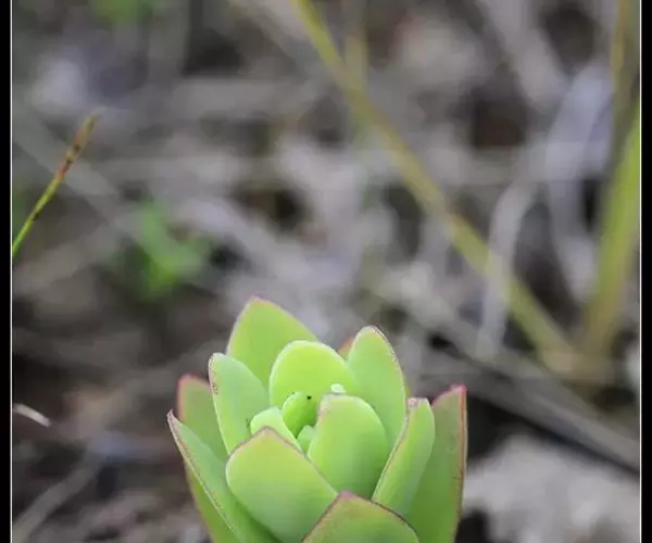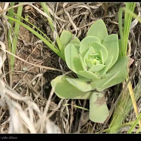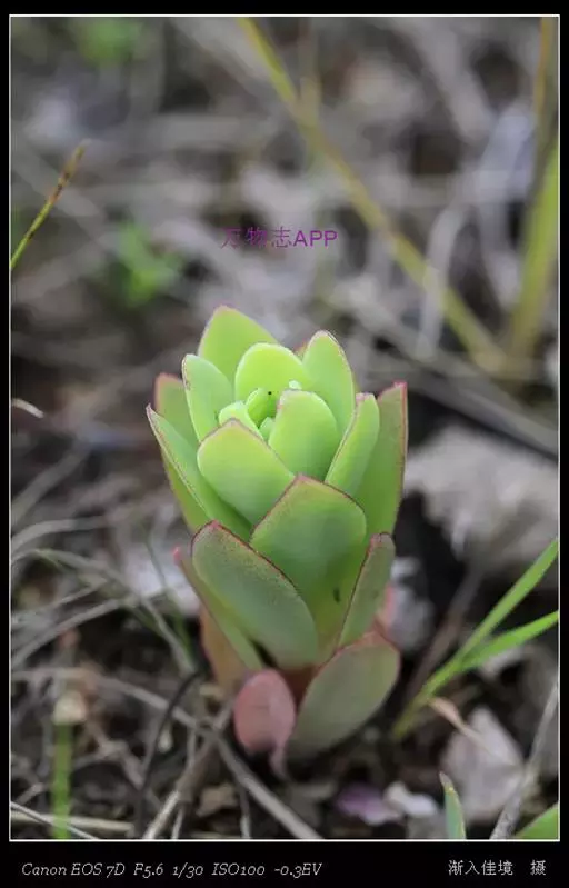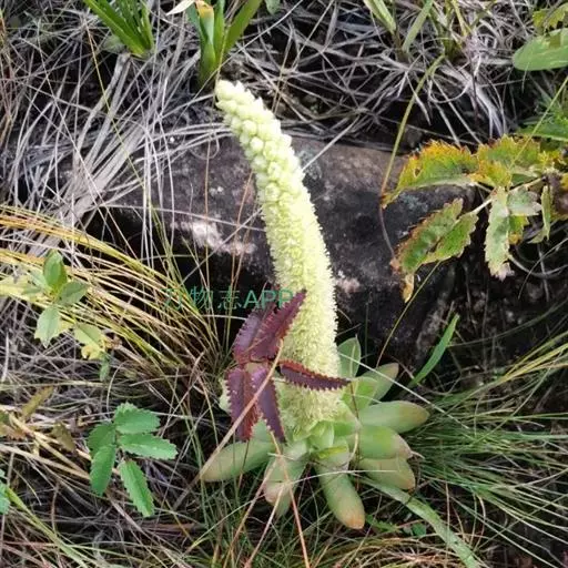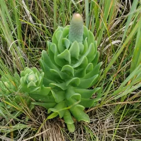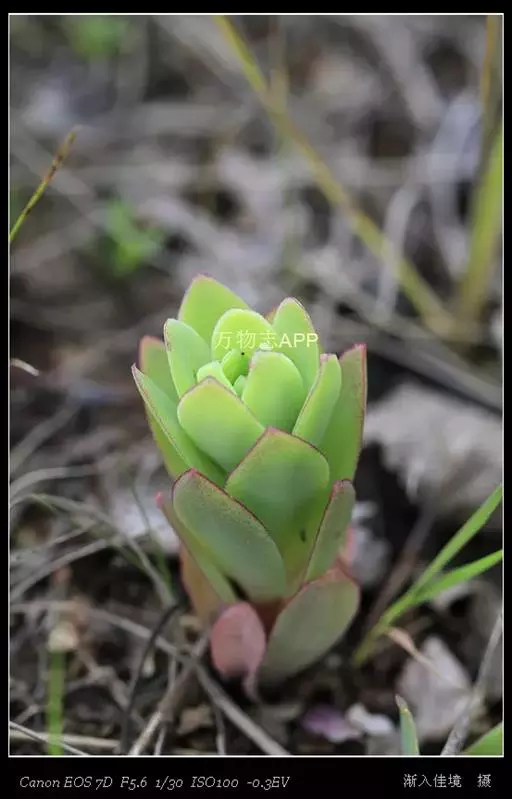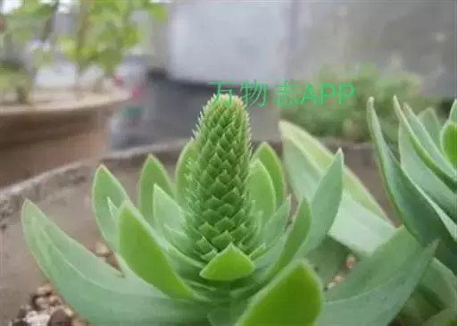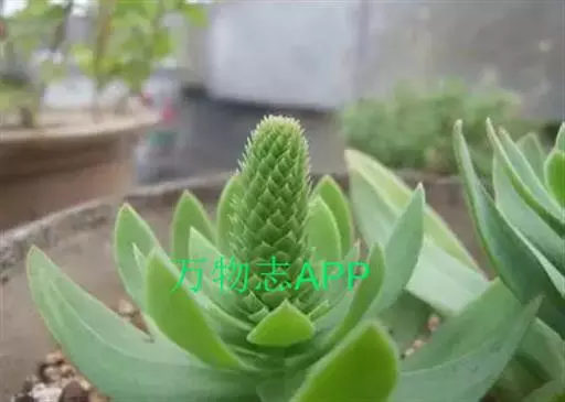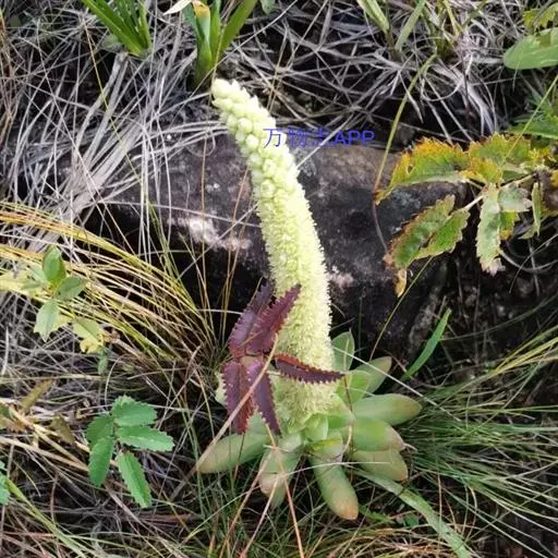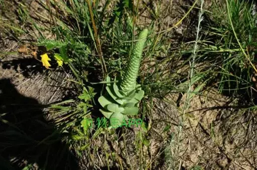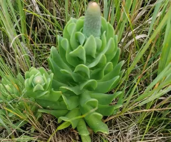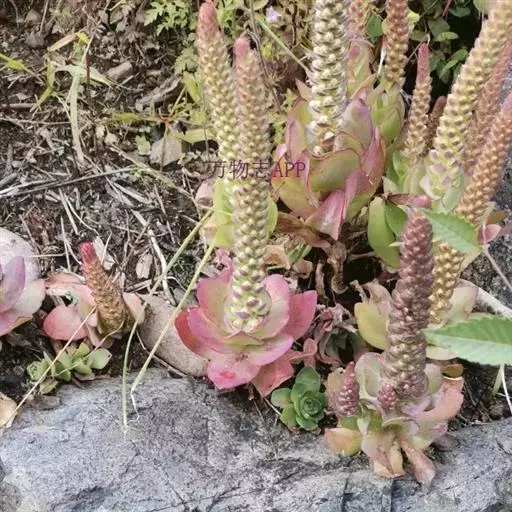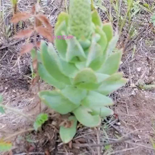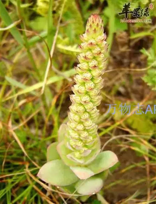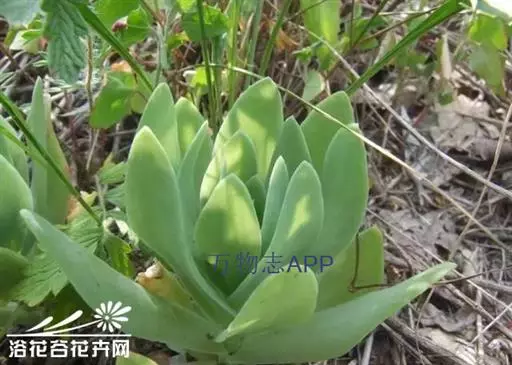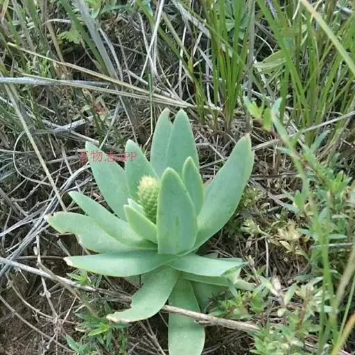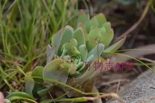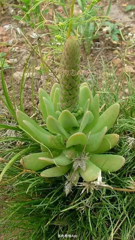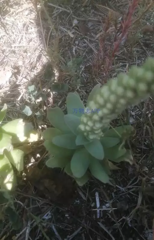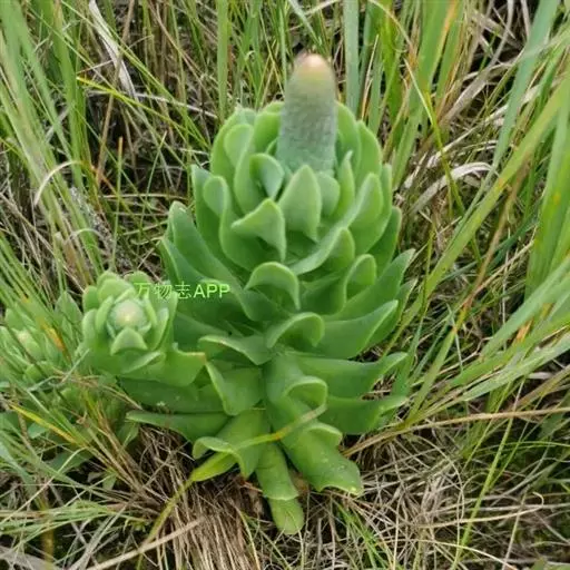 二年生草本。第一年植株有莲座丛;莲座叶先端不具刺,先端钝或短 钝叶瓦松 Orostachys malacophylla (摄影师:薛凯) 渐尖,长圆状披针形、倒卵形、长椭圆形至椭圆形,全缘。