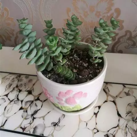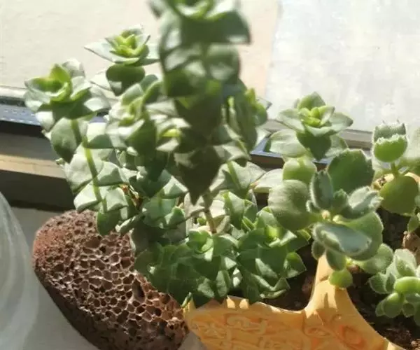 叶无柄,对生,密集排列成四列,叶片心形或长三角形,基部大,逐渐变小,顶端最小,接近尖形。叶色浓绿,在冬季和早春的冷凉季节或阳光充足的条件下,叶呈红褐或褐色,叶缘有白色角质层。整个植株叶片排列紧密而整齐,由基部向上逐渐变小,形成宝塔状,是一种奇特而美丽的多肉植物。