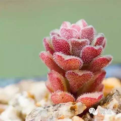 红稚儿Crassula pubescens subsp. radicans Toelken为景天科、青锁龙属多肉植物。植株丛生,有细小的分枝,茎肉质,时间养久了茎会逐渐半木质化,红稚儿叶片有点薄,叶片颜色绿。颜色反差巨大,平时为绿色,日照充足的春秋季节,变为火红色。野外分布于南非东开普省布什维德谷。喜温暖干燥和阳光充足的环境,怕低温和霜雪,耐半阴。叶形叶色较美,有一定的观赏价值;盆栽可放置于电视、电脑旁,可吸收辐射,亦可栽植于室内以吸收甲醛等物质,净化空气。