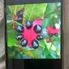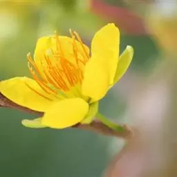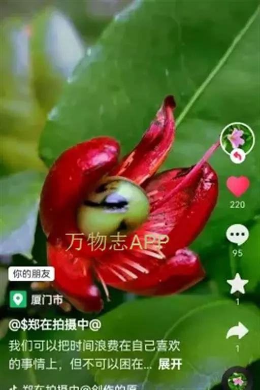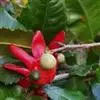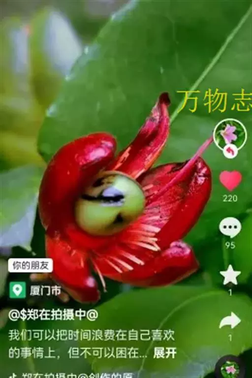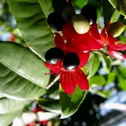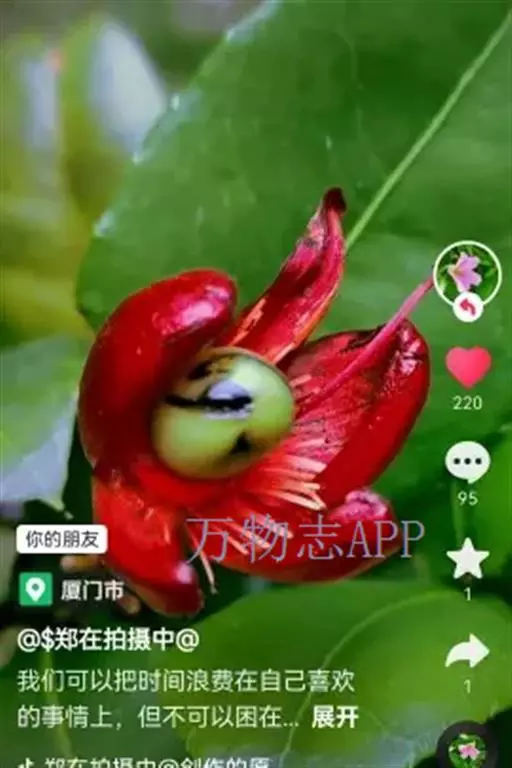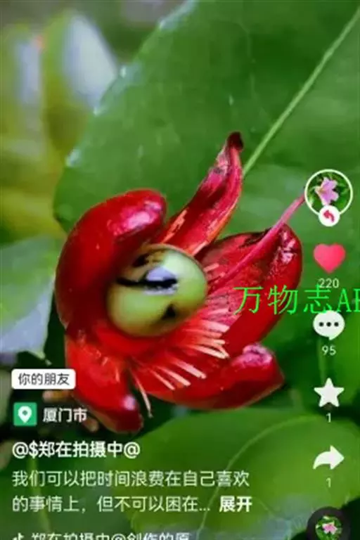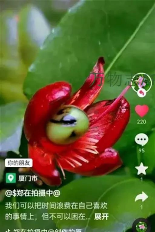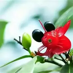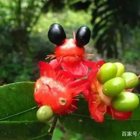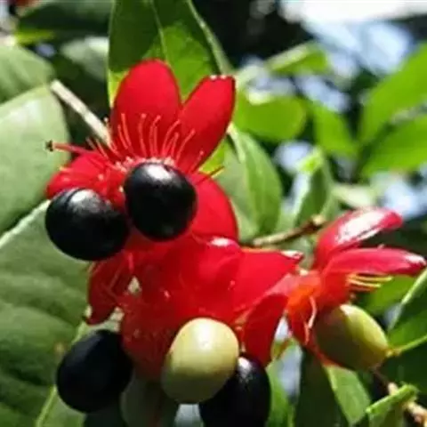 花小,两性,直径2-4厘米,离瓣花;花萼5片,结果时增大,宿存,暗红色;花瓣5片似勺形,长2厘米左右,黄色;雄蕊多数,黄色,花丝宿存;子房上位。每朵花开后,花托上着生I-6个浆果状的小核果,橄榄形,径5-7毫米,长7-11毫米,果皮薄,未成熟时绿色,成熟时黑色,每个果实中有种子1粒,褐色。