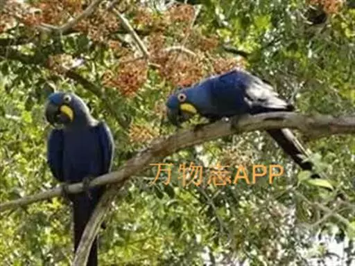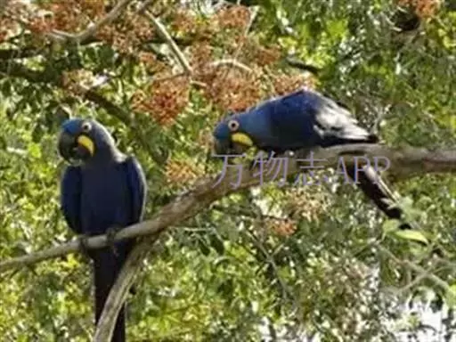 紫蓝金刚鹦鹉(学名:Anodorhynchus hyacinthinus):是鹦鹉家族中个头最大的成员,体长可达1米,体重超过1.5千克。鲜艳的蓝色羽毛和弯钩一样的巨大鸟喙使得它们格外惹人注目。喙钩曲,上颌具有可活动关节,喙基部具有腊膜。肌肉质舌厚,善仿其它鸟声和人语言。脚短,强大,对趾型,适于攀援生活。羽毛艳丽,具粉绒羽。晚成雏。