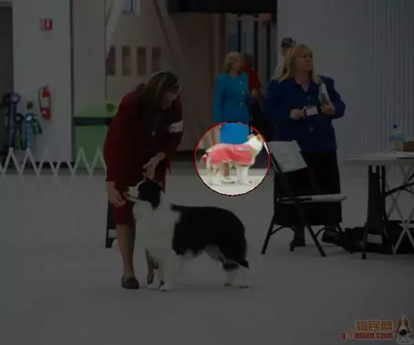 位置稍微有点斜,颜色深,表情聪明但很温和。眼睛不圆,丰满但不显眼,颜色不能很浅,眼圈颜色深,内眼角位于鼻尖到后枕骨的中 间位置。